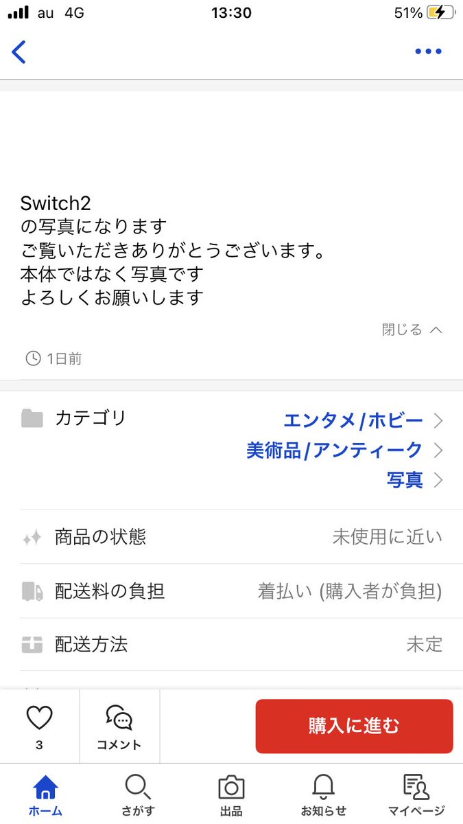 商品説明欄には「早い者勝ち お客さんに貰いました 値段の相場がわからないので調べてちょっと安くしてます #Switch2」と書かれ、14行改行されたあとに「Switch2の写真になります ご覧いただきありがとうございます。本体ではなく写真です よろしくお願いします」とつづられている。改行が多くされているため、初見では「写真」であることが分からない状態となっている。